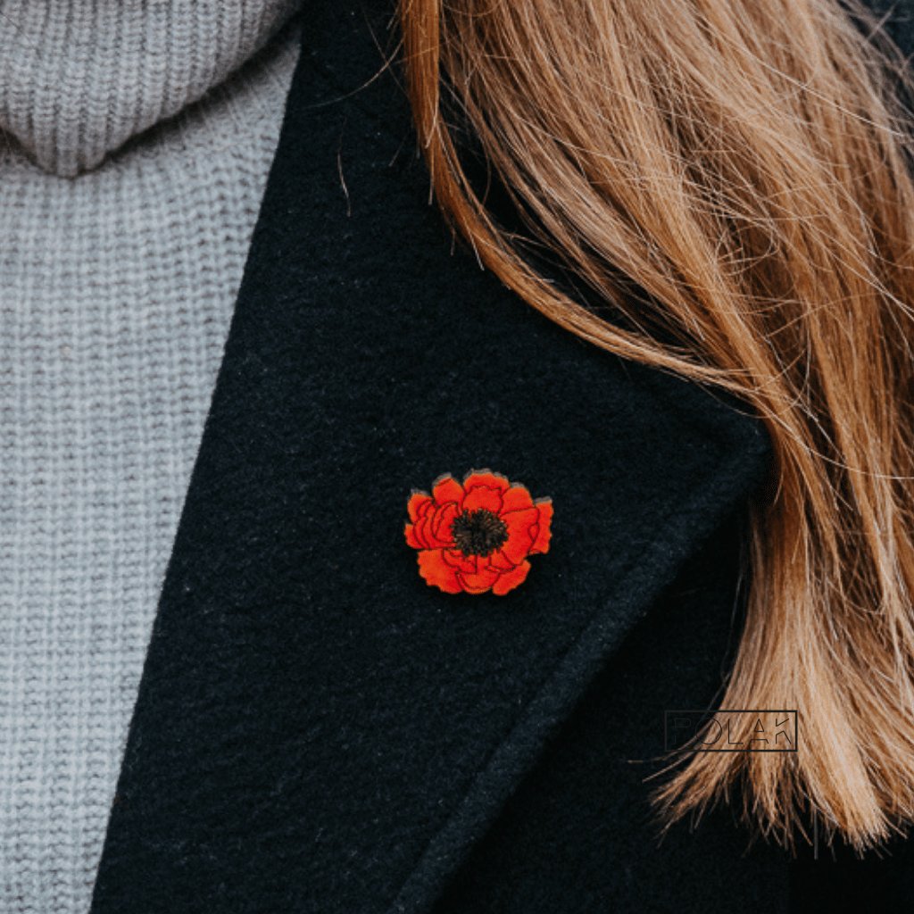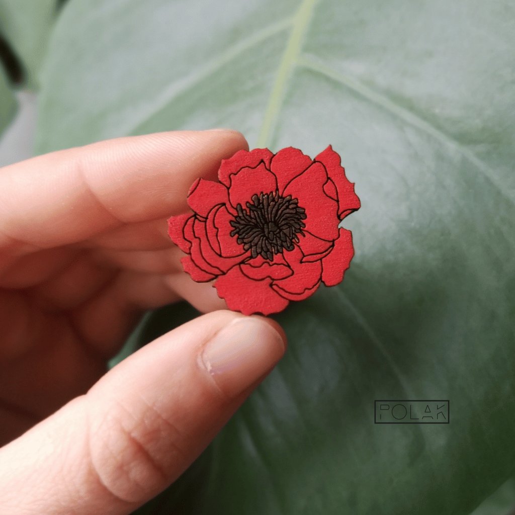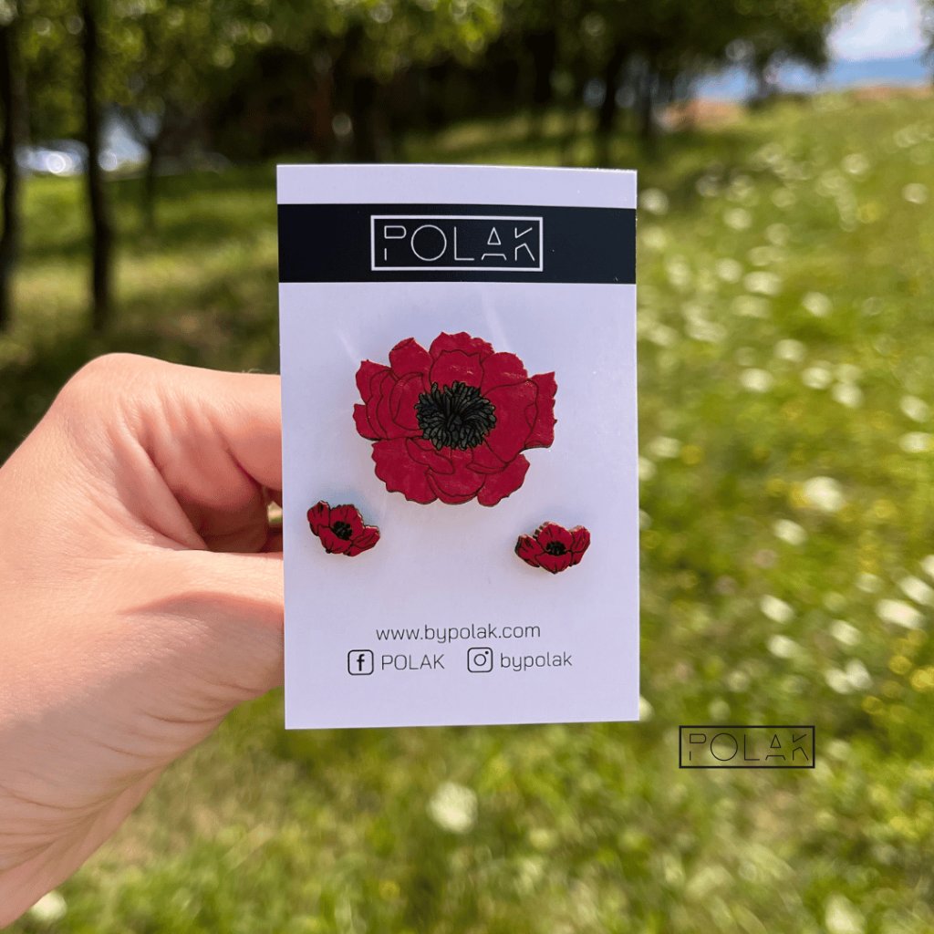 Dřevěné, ručně vyráběné náušnice Vlčí máky, které ozdobí obě uši + ručně vyráběná brož Vlčí mák v dárkovém setu ZA ZVÝHODNĚNOU CENU.