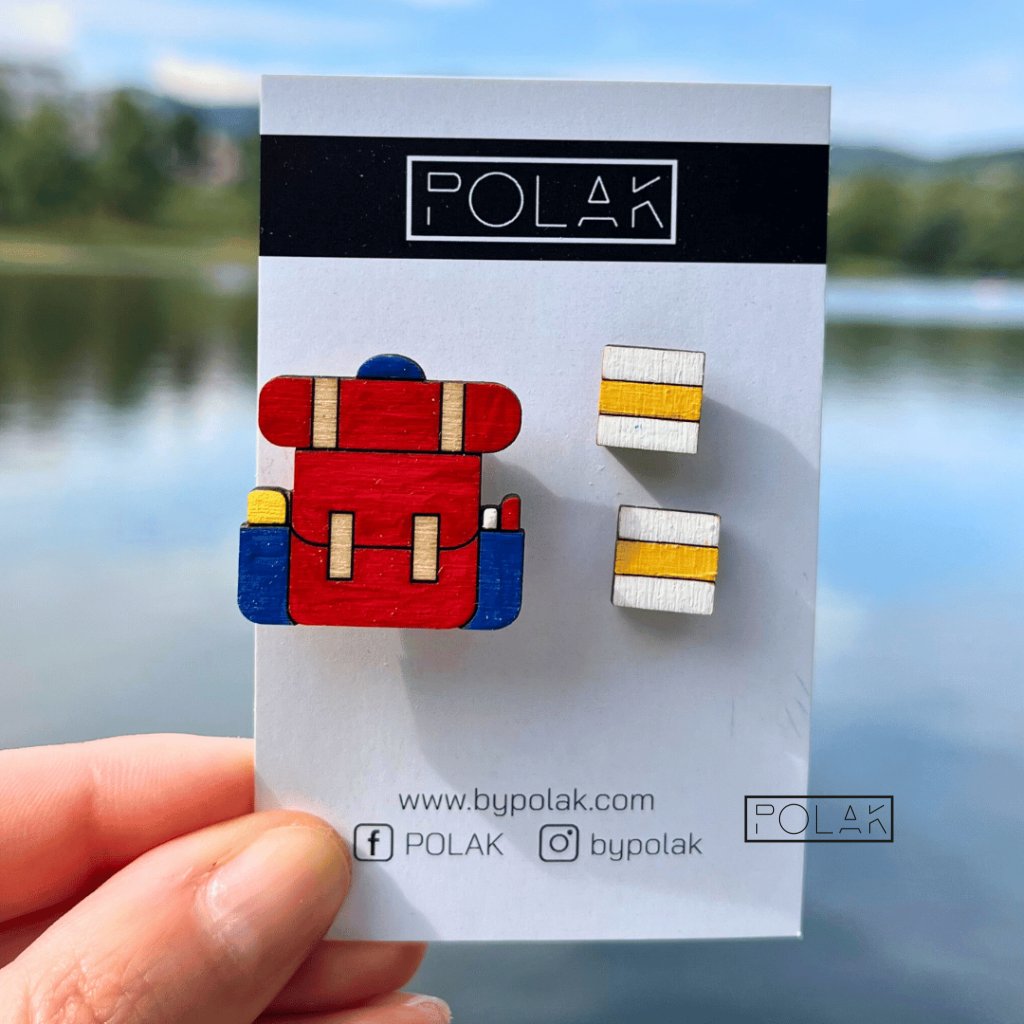 Dřevěné, ručně vyráběné náušnice Turistické značky, které ozdobí obě uši + ručně vyráběná brož Batoh v dárkovém setu ZA ZVÝHODNĚNOU CENU.