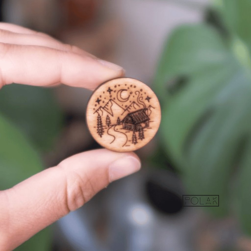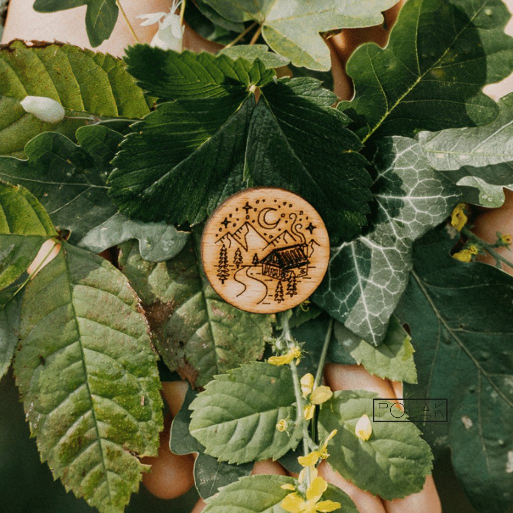 Dřevěná brož Chatař - domov v přírodě ruční výroba | originální dárek pro milovníky chataření