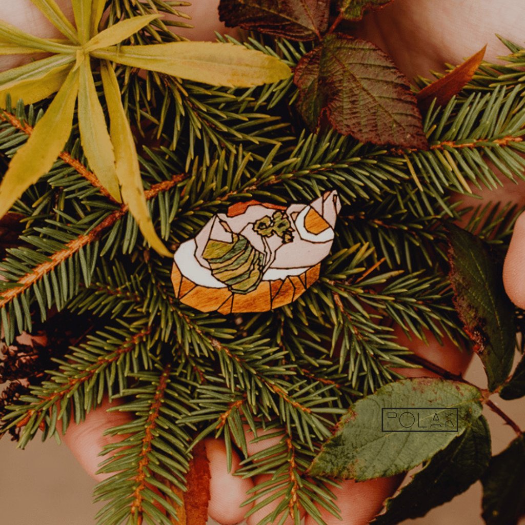 Dřevěná ručně vyráběná brož Chlebíček ze srdce Křivoklátska, s duší na Valašsku.