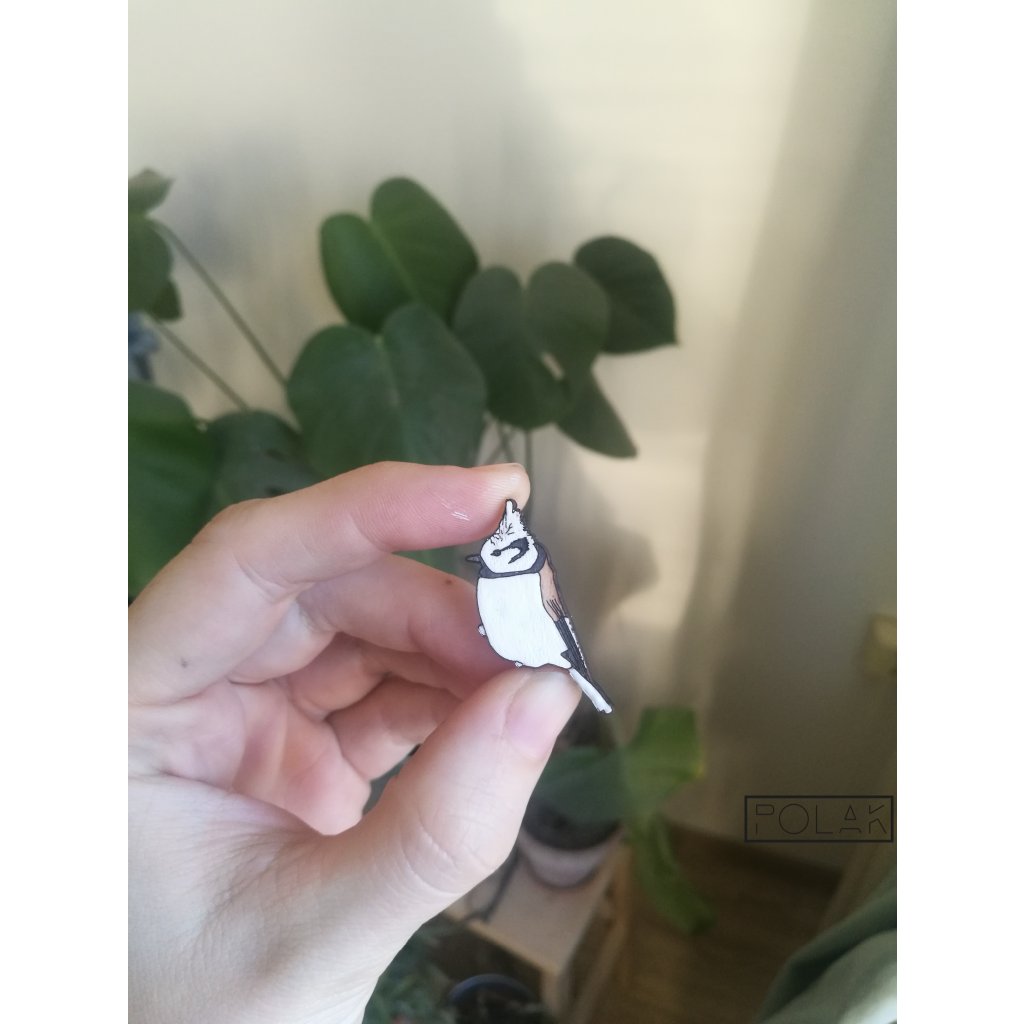 Dřevěná, ručně vyrobená brož Parukářka, ideální pro milovníky přírody, ornitology nebo kohokoli, kdo ocení decentní a zároveň originální doplněk.