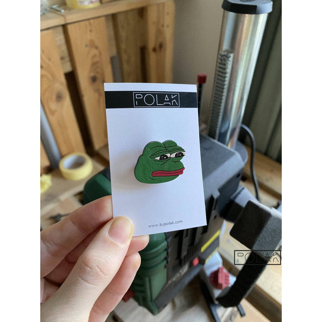 Dřevěná brož Sad Pepe zachycuje ikonické meme v hravé a originální podobě, která dodá vašemu outfitu špetku internetového humoru.