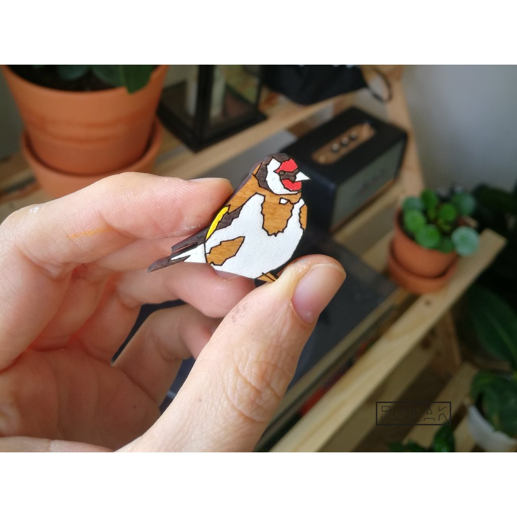 Dřevěná, ručně vyrobená brož Stehlík je ideální pro milovníky ptactva nebo kohokoli, kdo ocení unikátní a přírodní doplněk.