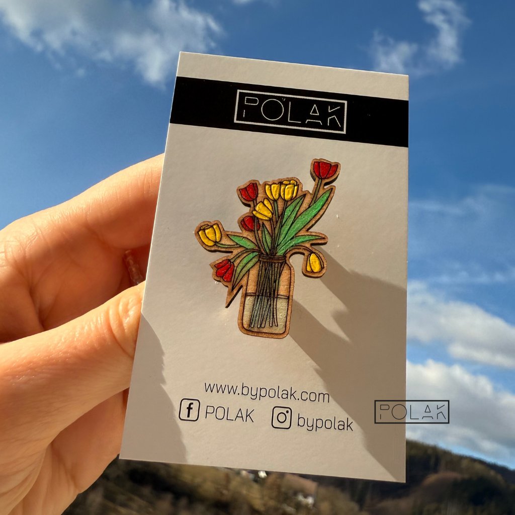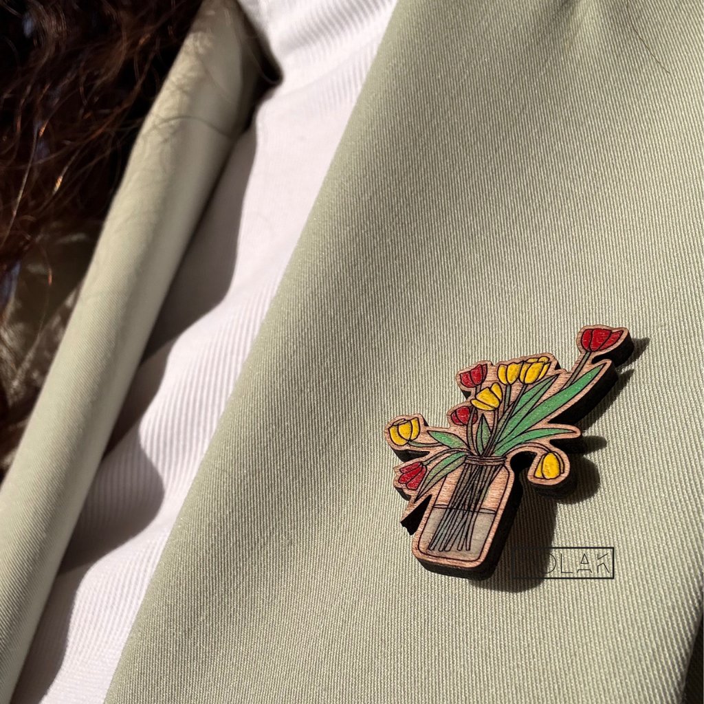 Dřevěná, ručně vyráběná brož Tulipány je skvělá volba pro ty, kdo milují výrazné a veselé doplňky.