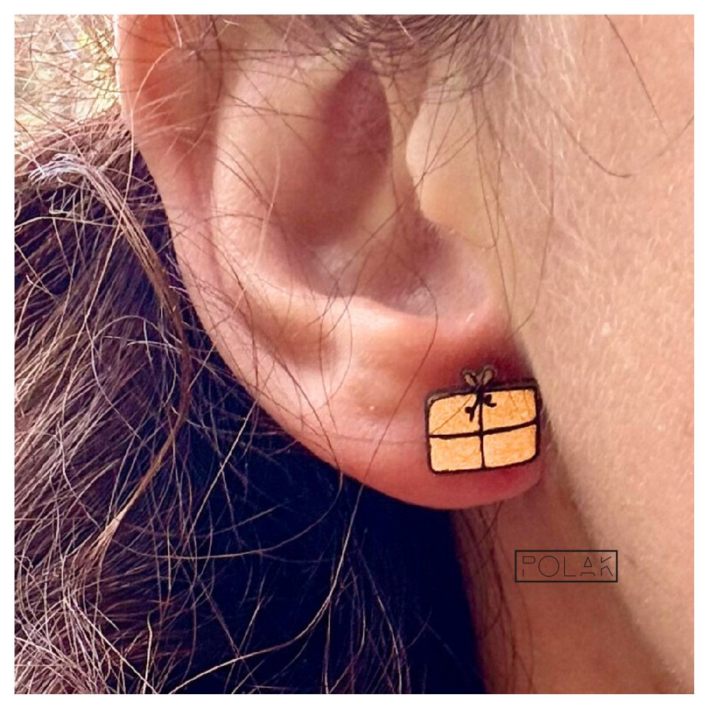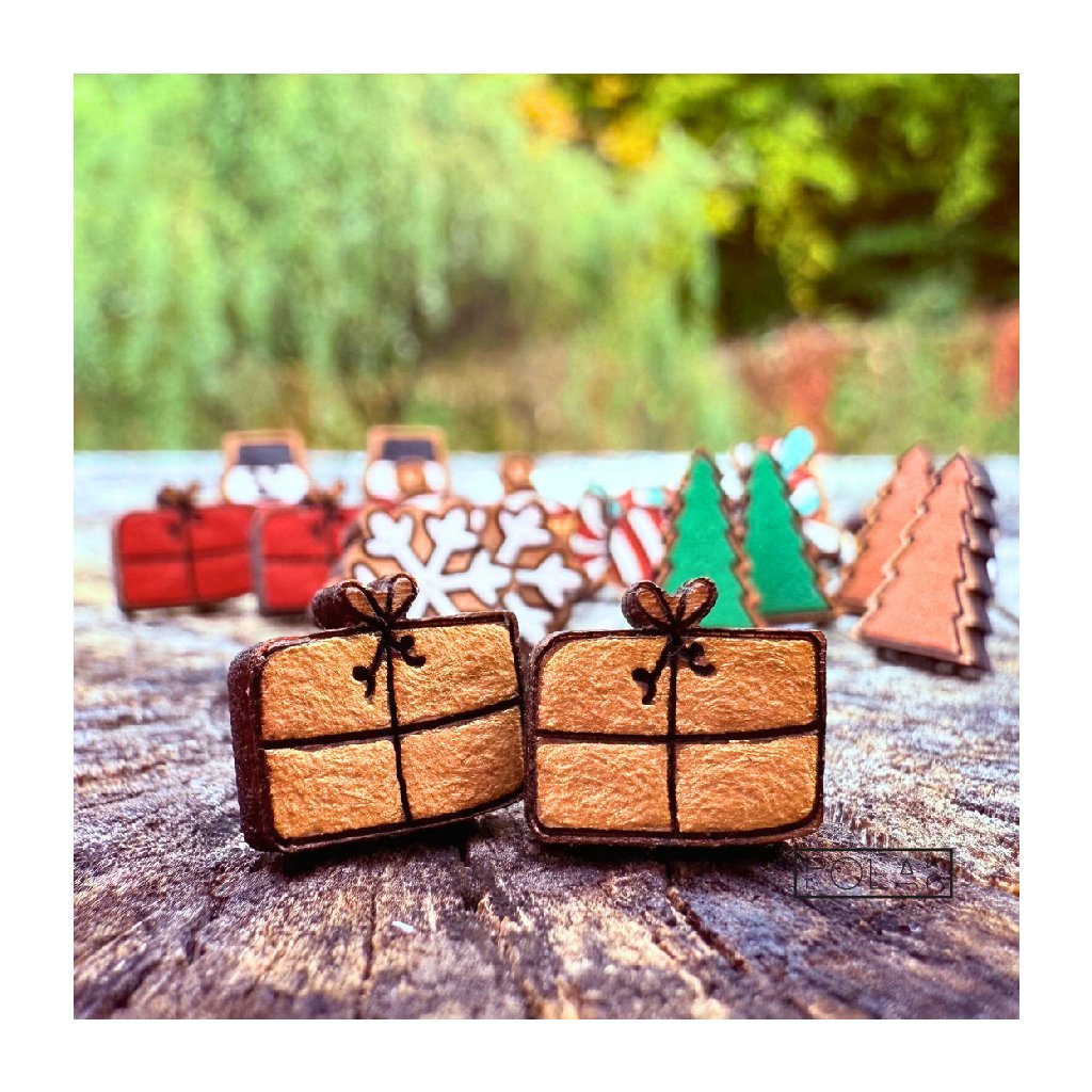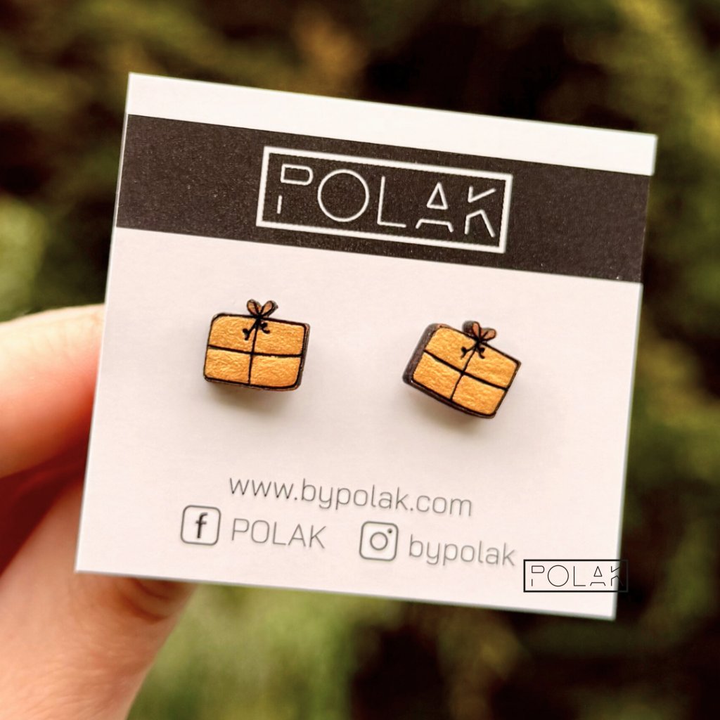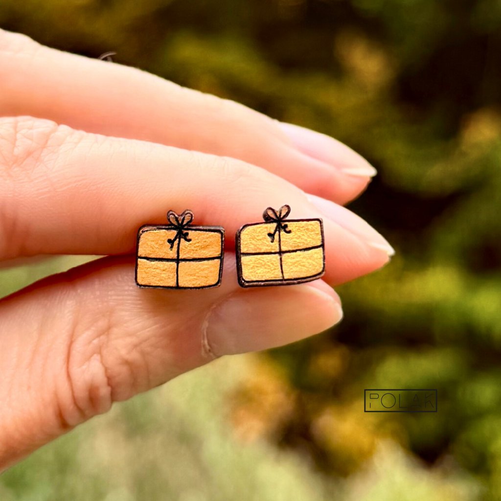 Dřevěné náušnice Dárečky zlaté - zabalená radost ruční výroba | originální dárek pro milovnice Vánoc