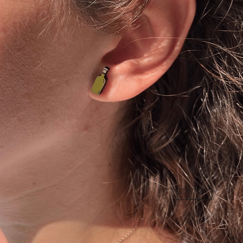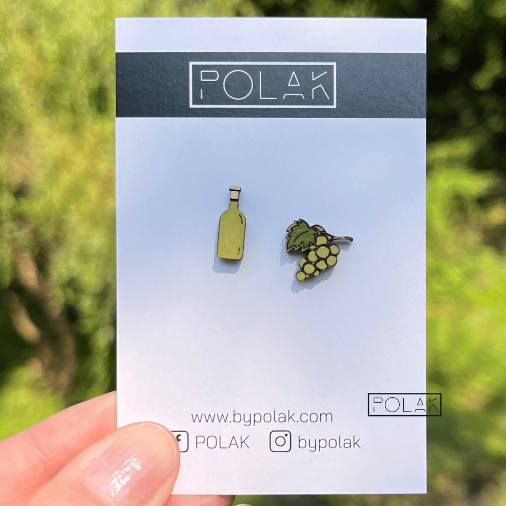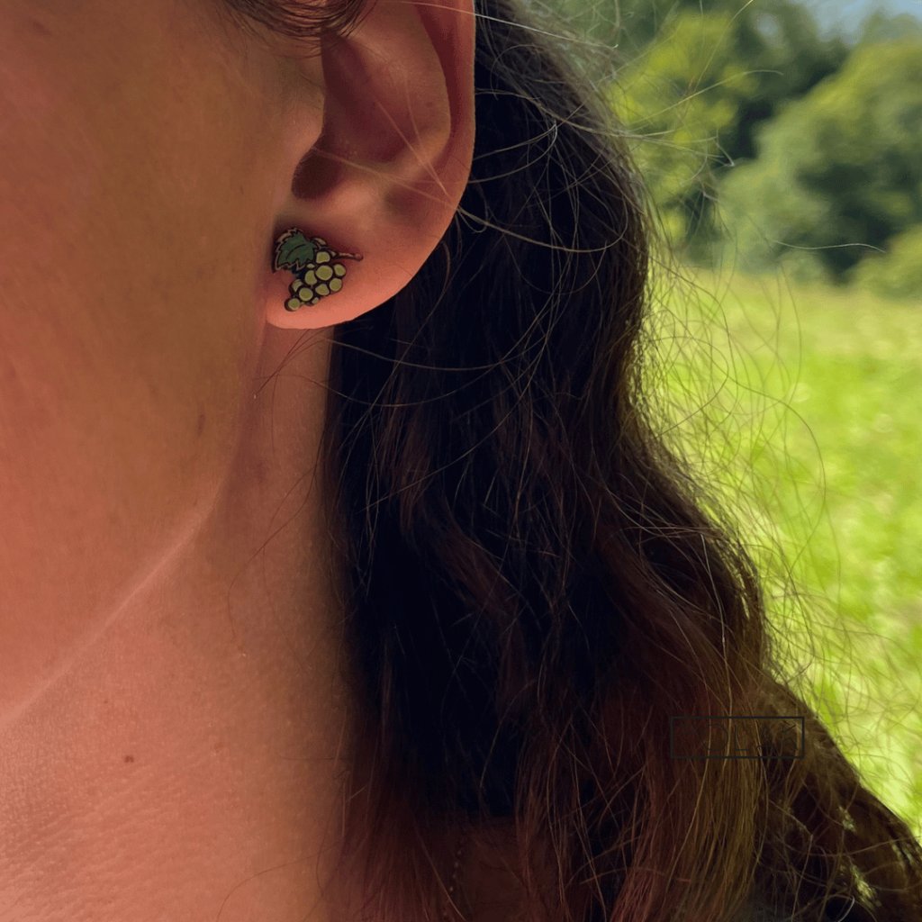 Bílé víno získává svou barvu, protože hrozny se fermentují bez slupek – to z něj dělá lehké a osvěžující pití. Tyto asymetrické dřevěné náušnice zachycují celý proces: jednu miniaturní láhev a jeden šťavnatý hrozen. Oslavte svou vášeň pro bílé víno s elegancí a humorem.