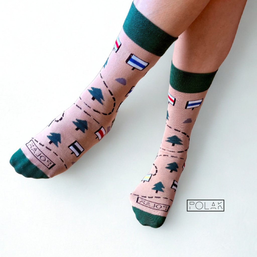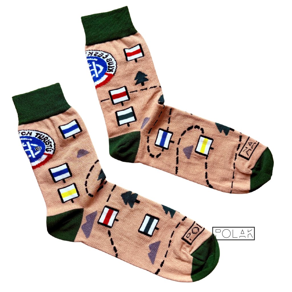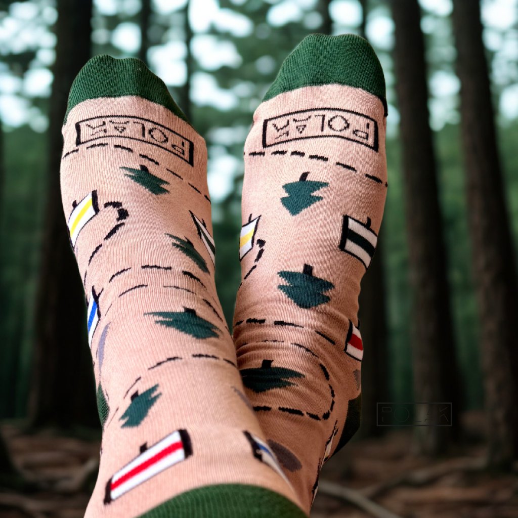 Motiv, který je na ponožkách vyobrazen, je autorským originálem. Nikde jinde, než na Turistických ponožkách - lesem křížem krážem, jej nenajdete.
